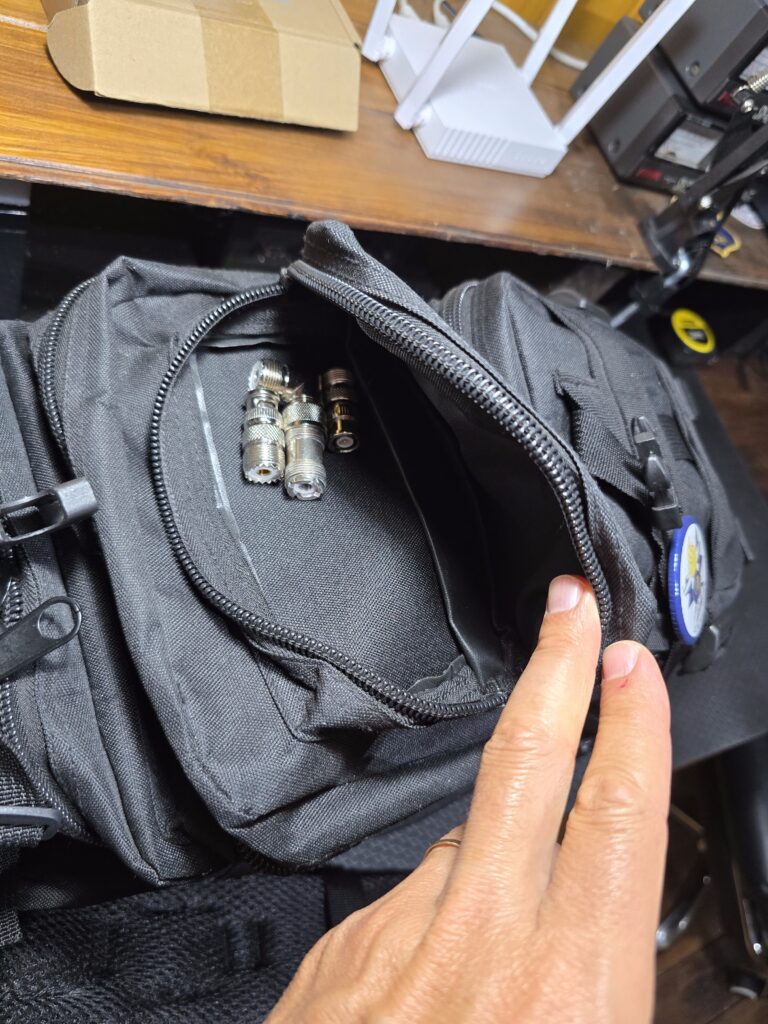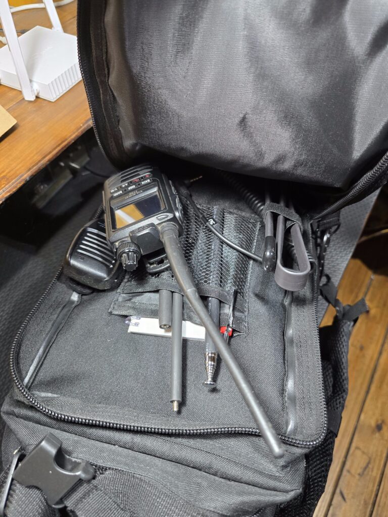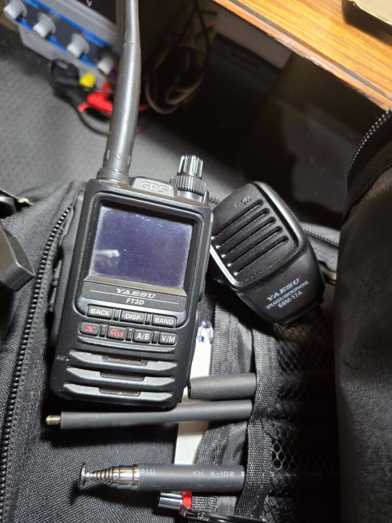 - En este mismo kit suelo llevar también mi handy analógico digital (C4FM) Yaesu FT-3D, con su antena original más una antena táctica de mayor ganancia.