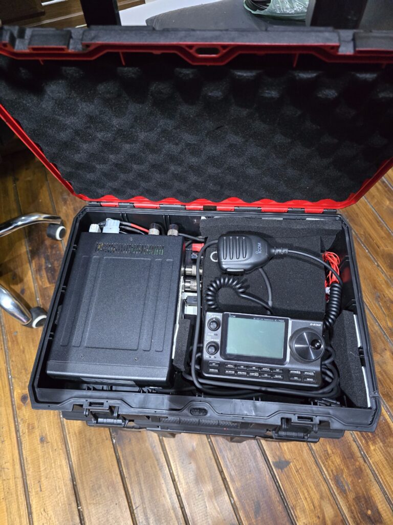 En la otra caja chica está montado el IC-7100 completo con el sintonizador de antena. El frente de operación del equipo se encuentra dentro de esta caja pero puede ser ubicado fuera de la misma extendiendo el cable que dispone el 7100 a tal efecto. Los conectores de antena y alimentación fueron montados en el exterior de esta caja.