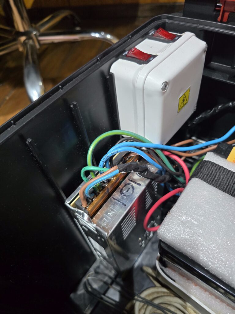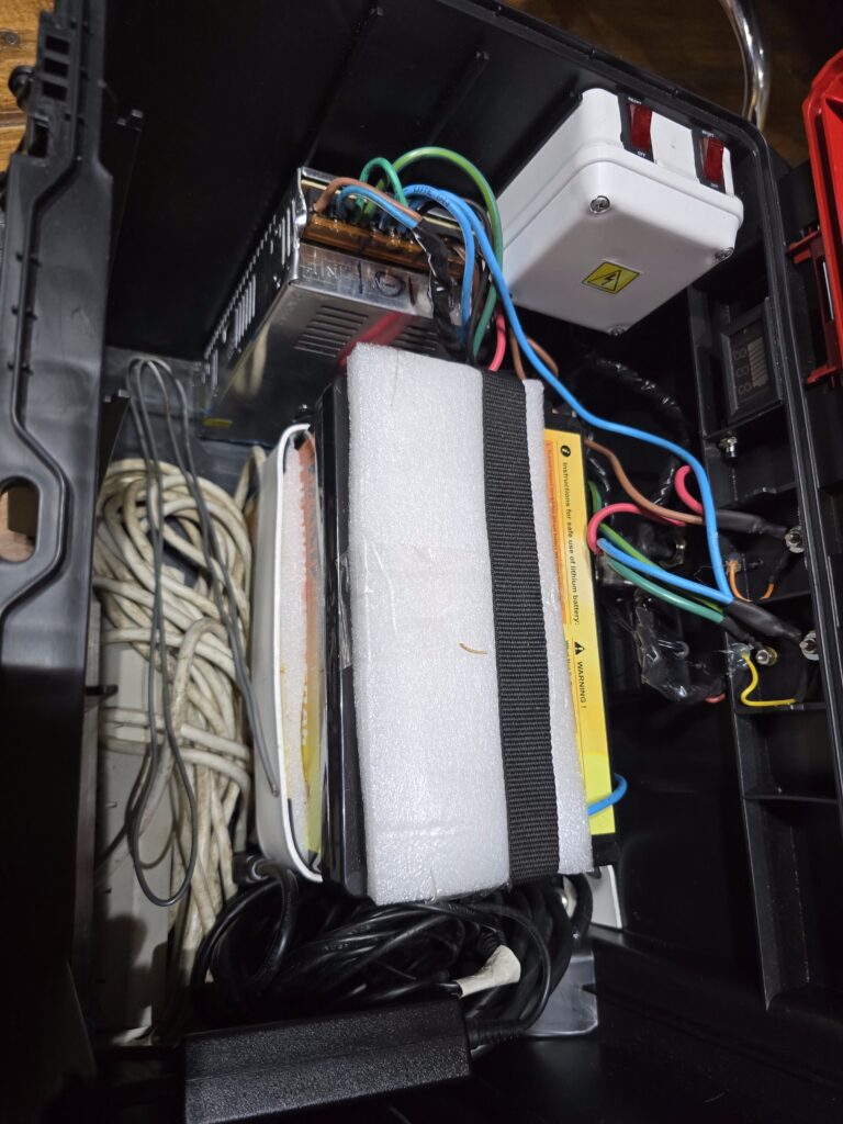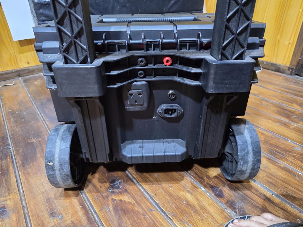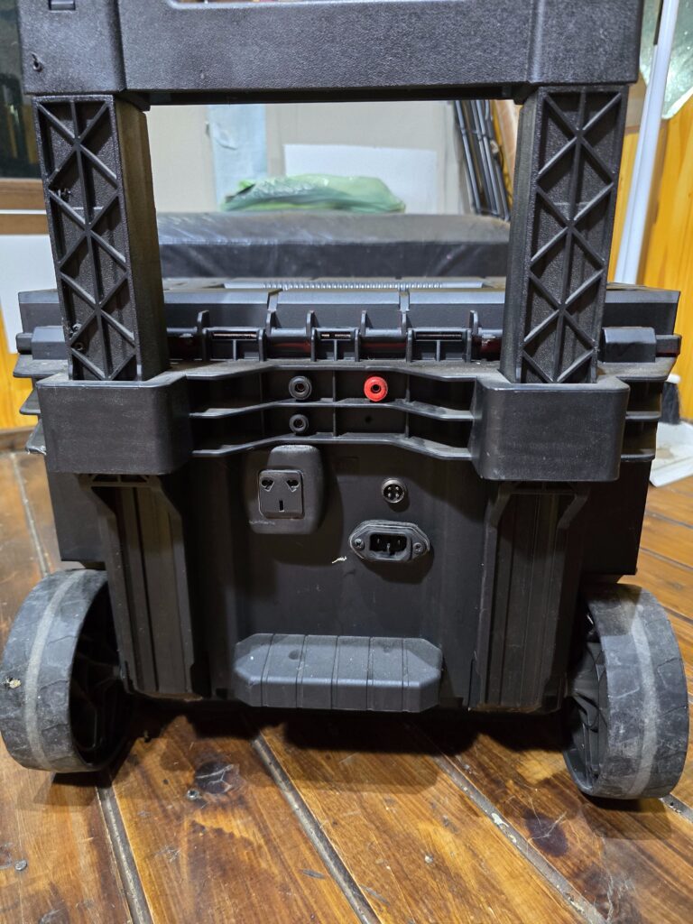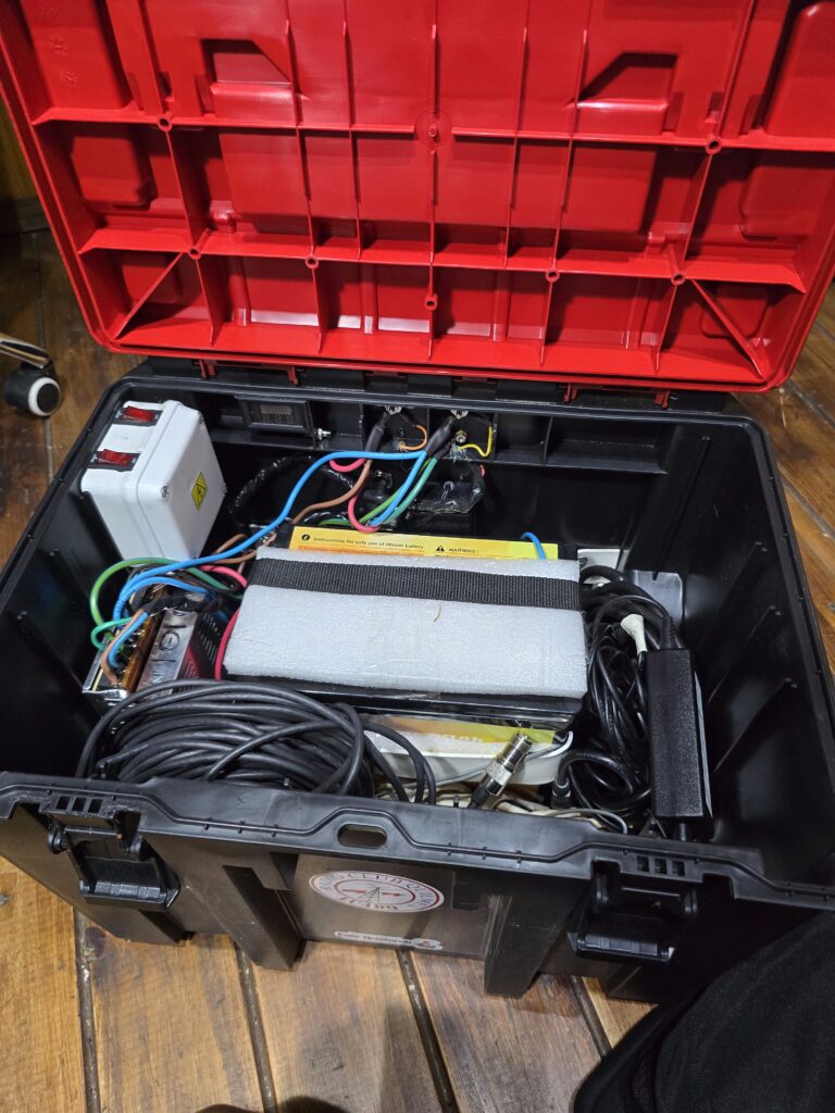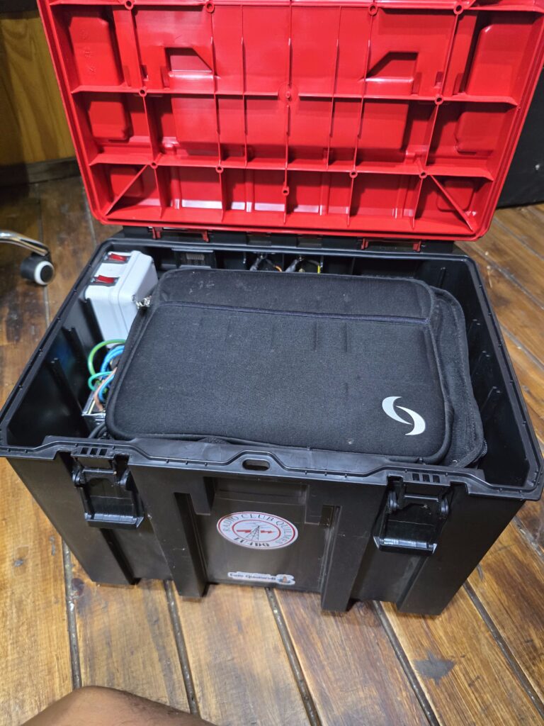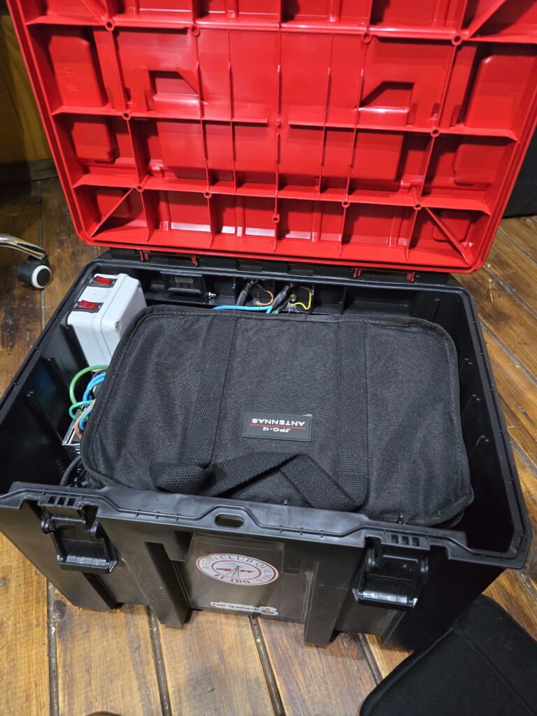 En la caja grande con ruedas se encuentra la batería, la fuente y el cargador. Todo con conexionado mediante fichas montadas en la caja para disponer de la salida de tensión de batería / fuente y la entrada de 220 V para cargador / fuente. En la misma caja suelo llevar los cables de 220 V y el que conecta la alimentación del equipo, más algún otro accesorio, la netbook, la antena JPC-12, etc.